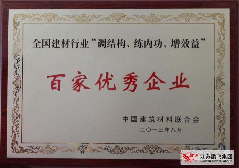 為樹立典型,有效遏制經濟效益下滑,推進建材行業調整結構和轉型升級,弘揚正能量,發揮優秀企業的典型示范作用,促進行業科學發展,中國建材聯合會與各省市地方建材行業協會聯手開展推薦表彰“調結構、練內功、增效益”百家優秀企業評比表彰活動。江蘇鵬飛集團強抓市場機遇,堅持科學發展之路,創新經營模式,被授予“調結構、練內功、增效益”百家優秀企業榮譽稱號。