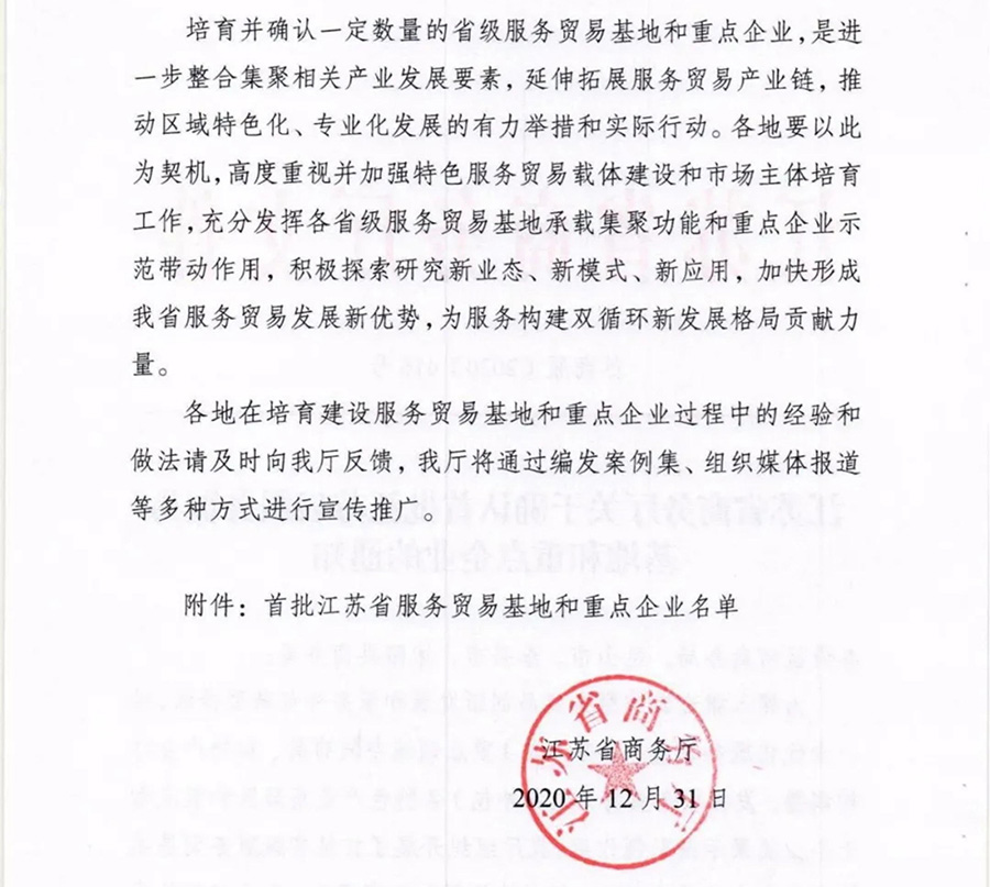 為深入推進江蘇省服務貿易創新發展和服務外包轉型升級,進一步優化服務貿易(服務外包)重點領域空間布局、加快產業結構調整,發揮服務貿易(服務外包)各特色產業集聚區和重點骨干企業集聚示范引領作用,江蘇省商務廳組織開展了首批省級服務貿易基地和重點企業遴選工作,江蘇鵬飛集團股份有限公司獲評省首批服務貿易重點企業。