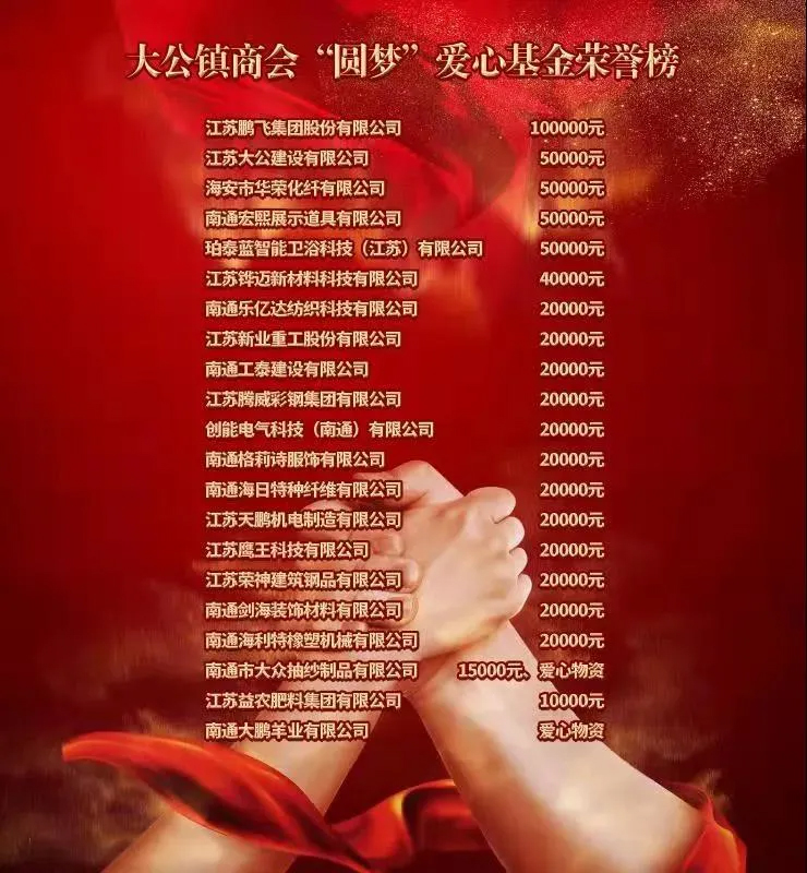 海安市政協副主席、市工商聯主席蔡祝平,大公商會會長、鵬飛集團董事長王家安共同為愛心基金揭牌,宣布大公鎮商會“圓夢”愛心基金正式成立!前期,大公鎮商會21家副會長單位共計籌集60.5萬元愛心善款,所募集資金主要用于:幫助困境青少年、開展青少年公益實踐等活動。
