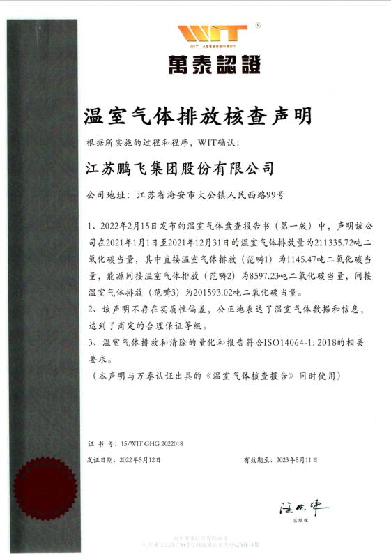 江蘇鵬飛集團股份有限公司2021年溫室氣體排放信息披露