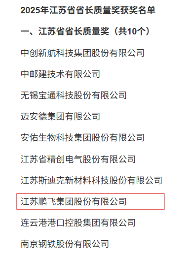 2月27日,2025年度江蘇省省長質量獎頒獎儀式在南京舉行,省長劉小濤為獲獎企業頒獎,充分肯定企業在質量領域的深耕與卓越追求。江蘇鵬飛集團股份有限公司作為獲獎企業之一,董事長王家安上臺領獎。