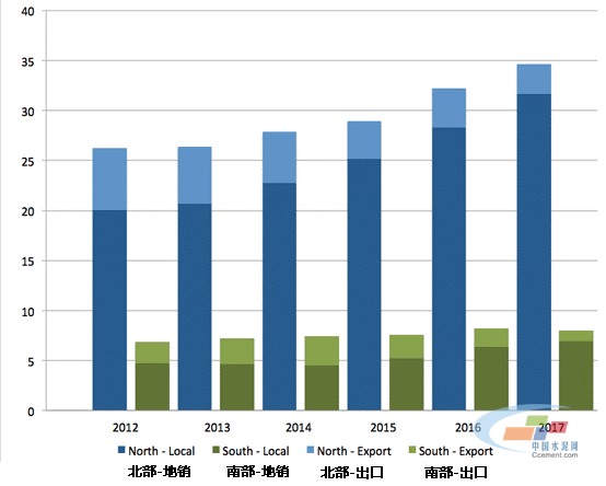 上圖展現了巴基斯坦國內水泥行業的現狀,巴基斯坦的年度水泥消費量從2012年的3310萬噸增長到了2017年的4280萬噸,增長幅度在30%左右,其中五分之四的水泥消費集中在巴基斯坦的北部地區。與此同時,更重要的是,巴基斯坦的出口水泥從2013年的830萬噸降低到了2017年的420萬噸。造成這一現象的主要原因是阿富汗市場的下跌,以及水性熟料出口量的減少??紤]到南方市場的出口水泥比例較高,盡管水泥總消費量在增長,但是出口量的減少對南方可能會造成更大的打擊。2018年到目前為止,類似的趨勢依然存在,唯一有所改變的是南方熟料出口量的在今年有反彈的跡象。
