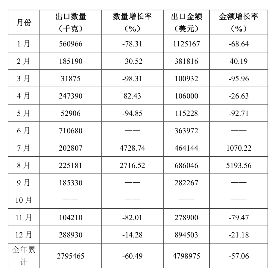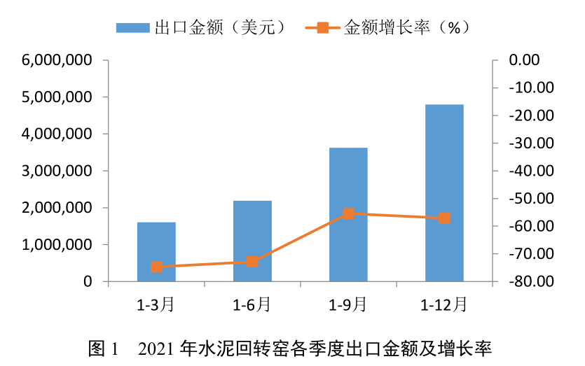 1  2021年水泥回轉窯出口數量、金額及增長率