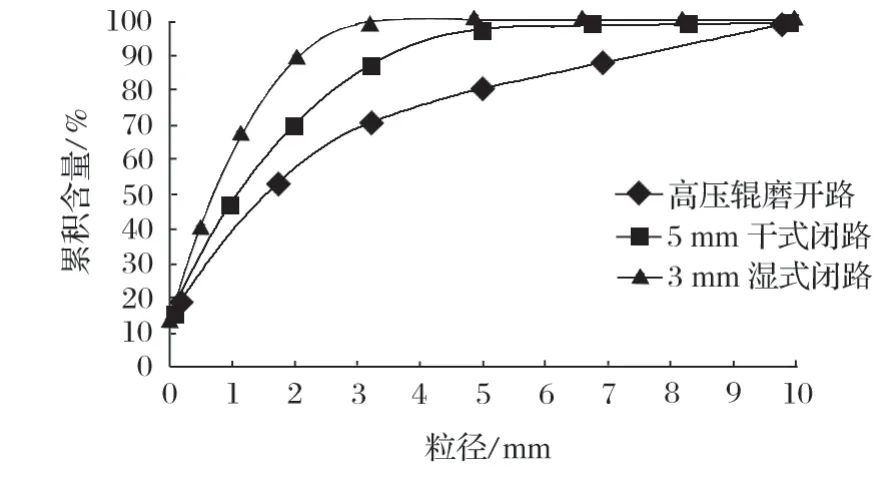 圖4 不同高壓輥磨工藝流程產(chǎn)品粒度曲線