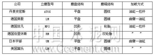 就當(dāng)前而言,立磨、輥壓機、筒輥磨三種料床粉磨設(shè)備都可以用于水泥及礦渣微粉的終粉磨。現(xiàn)以立磨為例,世界各知名公司的立磨都有其自主知識產(chǎn)權(quán),磨機內(nèi)部結(jié)構(gòu)不盡相同、各有千秋。國外立磨結(jié)構(gòu)形式見表2: