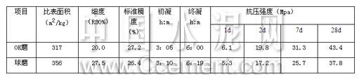 表中數(shù)據(jù)說明:在凝結(jié)時間、標(biāo)準(zhǔn)稠度需水量基本相同的前提下,OK磨磨制的水泥28d抗壓強度比球磨水泥高出15%,同時,水泥的早期強度也高,可進一步增加混合材摻量,降低水泥生產(chǎn)成本。