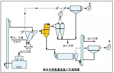 此工藝運用于VPM立磨功率與球磨機功率比值大于0.5的場合,該系統主要優點是系統產量高(增產100%以上),單位電耗低。