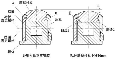 圖1 磨輥襯板安裝及輥體磨損示意