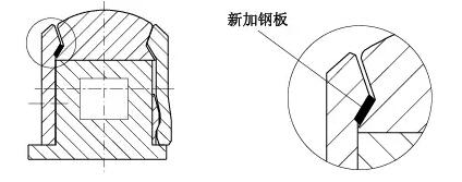 骨架密封厚度15mm,拆下壓蓋用車床將骨架密封擋邊車薄5mm,壓蓋密封槽深度由18mm加深到23mm(見圖4)。此法使得骨架密封在高速軸上的安裝位置向外移動(dòng)5mm,避開高速軸上的溝槽。經(jīng)此處理,解決了漏油問題,可以正常生產(chǎn),等到計(jì)劃?rùn)z修停機(jī)時(shí),再?gòu)氐滋幚砀咚佥S上的溝槽。
