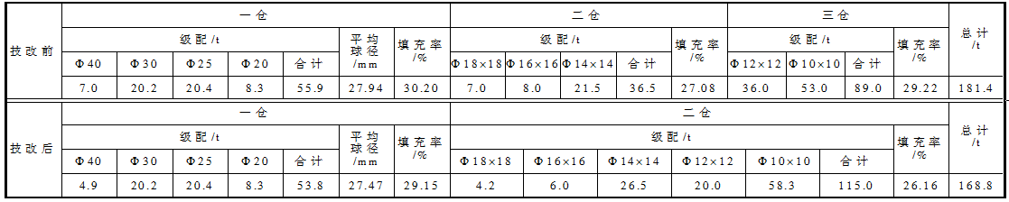 經多次考察并做篩余曲線和顆粒級配分析后決定,將磨機二、三倉合并,原一倉倉長3.7m,二倉倉長2.7m,三倉倉長6.1m,改造后一倉倉長3.7m,二倉倉長8.8m,同時調整研磨體平均球徑及填充率,技改前后研磨體級配對比見表2。