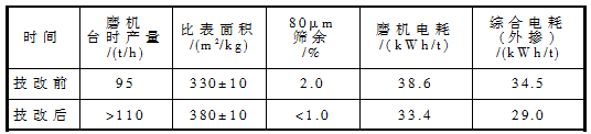此項技改效果較明顯,生產P·O42.5水泥臺時產量從105t/h增加到108t/h,80μm篩余從2.0%降到1.2%,磨機功率從2650kW左右下降至2450kW,比表面積從330m2/kg增加到340m2/kg。