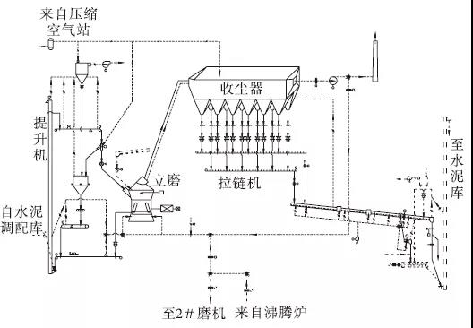 生產(chǎn)P·O42.5水泥時工藝流程是:熟料、石膏、石灰石、粉煤灰、礦渣等物料經(jīng)輸送設備輸送至各配料倉,粉煤灰從粉煤灰?guī)煜陆?jīng)輸送設備進入生產(chǎn)系統(tǒng)。各種物料按一定比例設定,分別經(jīng)各定量給料機和輸送設備送至入磨鎖風閥后入磨。入磨物料在磨內(nèi)進行烘干和粉磨,粉磨后的物料經(jīng)選粉機分離,粗粉返回磨盤重新粉磨,合格細粉隨氣流直接進入袋式收塵器進行收集,收集下來的成品經(jīng)空氣斜槽、斗式提升機等輸送設備入水泥庫儲存;立磨吐渣經(jīng)輸送設備(設有除鐵器)進入循環(huán)斗式提升機,提升入磨后繼續(xù)粉磨。沸騰爐提供的熱風與循環(huán)風、冷風混合后進入磨內(nèi),磨內(nèi)混合風起到烘干和提升物料的作用,出磨氣流進入布袋收塵器;出布袋收塵器的氣體經(jīng)循環(huán)風機后一部分經(jīng)循環(huán)風管,作為循環(huán)風入磨,其余氣體經(jīng)煙囪排入大氣。系統(tǒng)工藝流程見圖1。