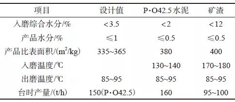 JLMS-46.4立磨主要技術(shù)參數(shù)見表1,水泥與礦渣主要工藝參數(shù)見表2。