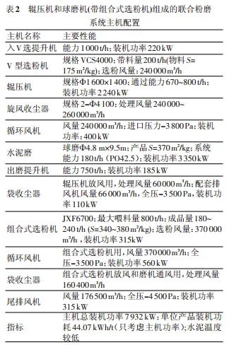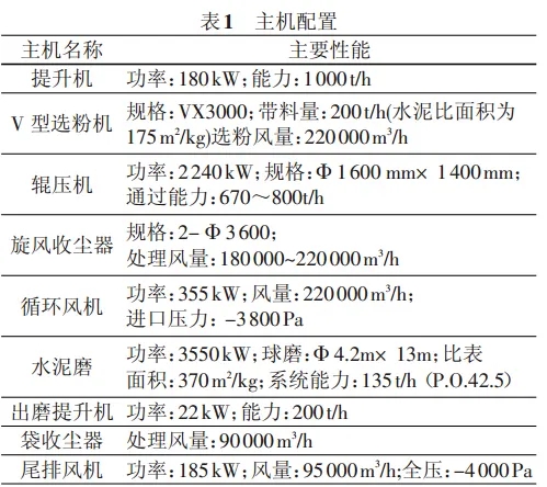 此系統主要由 V 型選粉機、輥壓機、旋風收塵器、球磨機和組合式選粉機組成,球磨機系統為閉路系統,流程圖見圖 3,主要的主機配置見表 2。其中輥壓機系統設有單獨放風系統,球磨機單獨通風與組合式選粉機放風共用一套收塵系統。