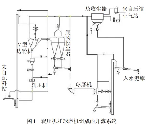 此系統主要由 V 型選粉機、輥壓機、旋風收塵器和球磨機組成。球磨機系統為開流系統,輥壓機系統放風與球磨機通風共用一套收塵系統。流程見圖1,主機配置見表 1。