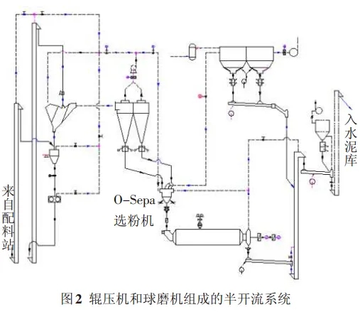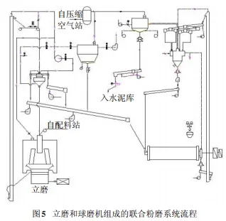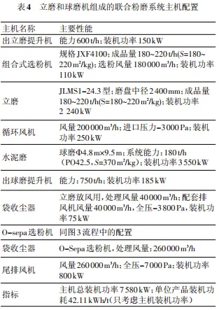 此系統主要由立磨、組合式選粉機、球磨機和O-Sepa 選粉機組成,球磨機系統為閉路系統,流程圖見圖 5,主要的主機配置見表 4。