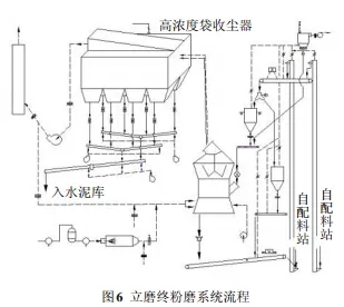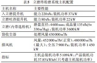 此系統主要由立磨、高濃度袋收塵器和風機組成,流程圖見圖 6,主要的主機配置見表 5。此系統其特點是:流程簡單,系統電耗低;廠房占地少,立磨又可以露天布置,因此土建費用相對較少;另外立磨的維修量比輥壓機要少,所以運轉率較輥壓機系統高。