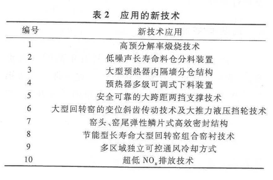通過多年的自主研發(fā)和實(shí)踐經(jīng)驗(yàn)積累,我公司在本工程上應(yīng)用了大量的回轉(zhuǎn)窯新技術(shù),確保回轉(zhuǎn)窯系統(tǒng)的節(jié)能、環(huán)保、高效。具體應(yīng)用的新技術(shù)列于表2。