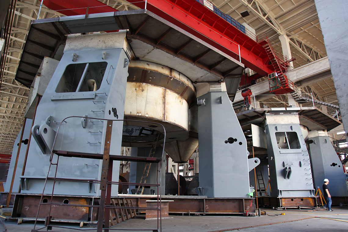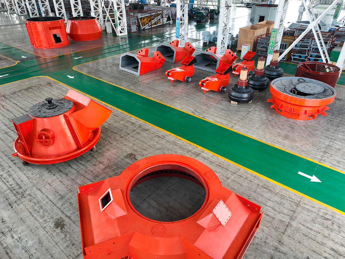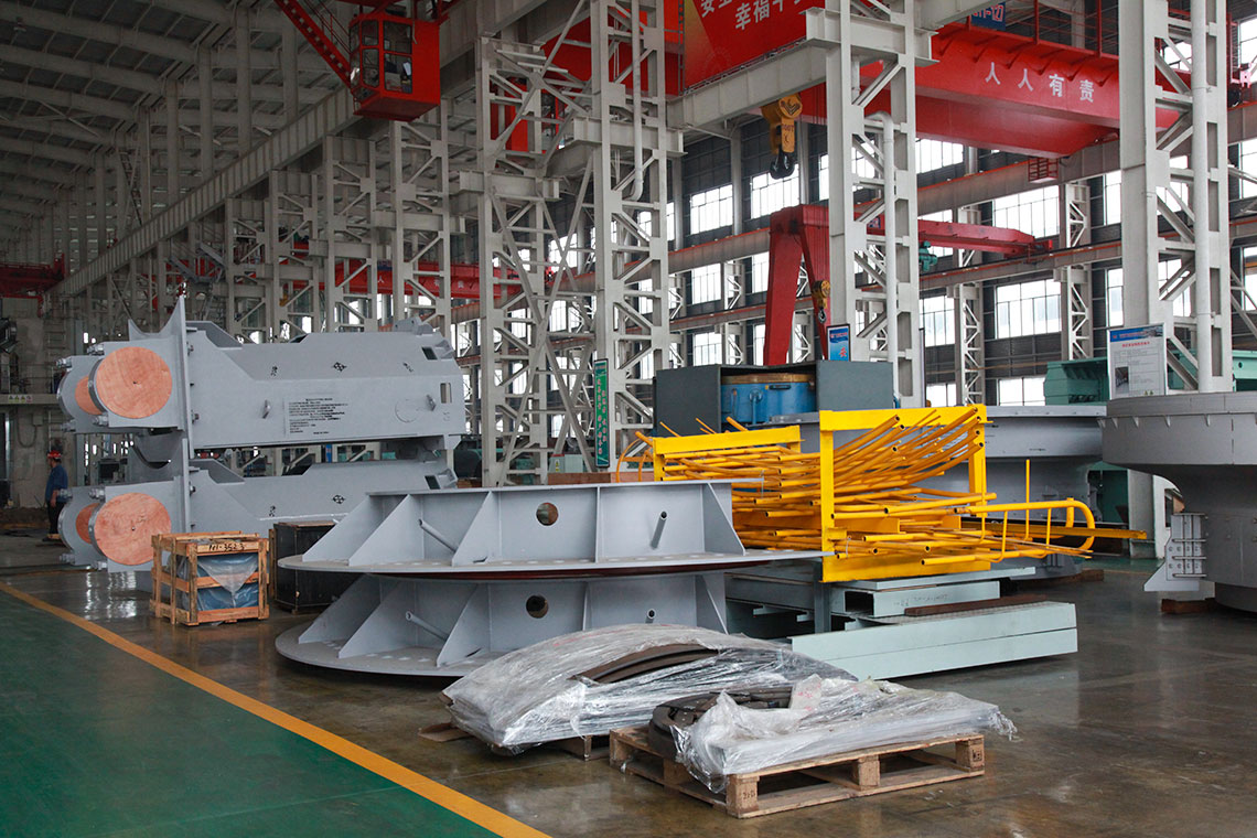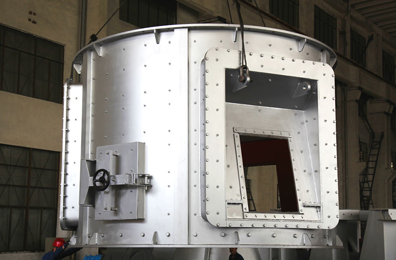 磨煤機三個磨輥由旋轉的磨盤帶動進行碾磨作業。入磨物料經中心落煤管落在磨盤上后,由旋轉磨盤產生的離心力將其輸送至碾磨輥道上碾磨。碾磨壓力由彈簧或液壓加壓裝置產生,通過靜定的三點系統,碾磨力均勻地傳至三個磨輥,通過加壓系統壓力傳至基礎。煤粉的干燥和輸送利用熱風來進行。熱風通過噴嘴環均勻分布于磨盤四周,將經碾磨的物料干燥并輸送至磨機上部的分離器。物料的粗細粉在此分離,細粉排出磨機,粗粉重新返回磨內碾磨。物料中的一些不可破碎物可通過磨機下部的排碴口排出。磨煤機主要由基礎部,減速機,下架機,中架機,磨盤,磨輥,加壓裝置,分離器,正壓風密封裝置,蒸汽吹掃裝置等部件組成,還配有主電動機,潤滑油站,液壓站和密封風機等附屬設備,另備有慢速傳動裝置,安裝檢修專用工具,扶梯平臺,煤粉分配器,速斷閥等配套設備供用戶選用。磨煤機采用液壓加壓系統,在運行中即可對粉磨壓力進行調整,并具有更好的過鐵保護性能。在原標準型的基礎上增加了磨輥翻出裝置,并提高了磨體的抗爆能力。